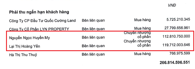 Theo BCTC hợp nhất quý 4/2025, QCG có khoản phải thu chuyển nhượng cổ phần đối với bà Nguyễn Ngọc Huyền My - em gái Tổng Giám đốc Nguyễn Quốc Cường - số tiền 113 tỷ đồng. Đồng thời, Doanh nghiệp cũng phát sinh khoản phải thu gần 120 tỷ đồng từ bà Lại Thị Hoàng Yến, con gái Chủ tịch HĐQT QCG Lại Thế Hà.