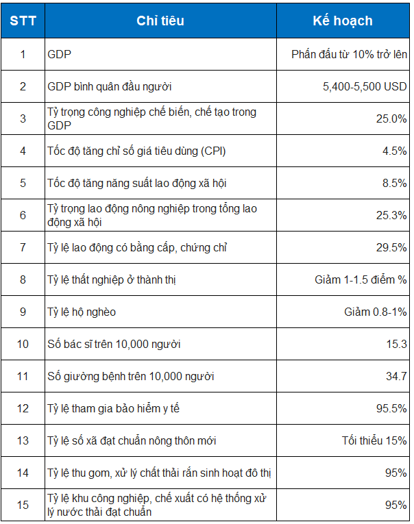Từ mục tiêu tổng quát, các chỉ tiêu cụ thể được xác định là: Tốc độ tăng tổng sản phẩm trong nước (GDP) phấn đấu từ 10% trở lên. GDP bình quân đầu người đạt 5,400-5,500 USD. Tỷ trọng công nghiệp chế biến, chế tạo trong GDP đạt khoảng 24.96%. Tốc độ tăng chỉ số giá tiêu dùng (CPI) bình quân khoảng 4.5%. Tốc độ tăng năng suất lao động xã hội bình quân khoảng 8.5%. Tỷ trọng lao động nông nghiệp trong tổng lao động xã hội đạt khoảng 25.3%. Tỷ lệ lao động có bằng cấp, chứng chỉ đạt khoảng 29.5%.