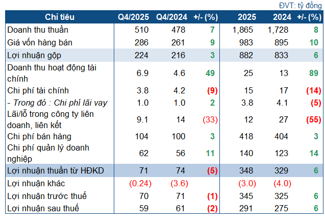 Quý 4/2025, DBD đạt gần 510 tỷ đồng doanh thu thuần, tăng 7% so với cùng kỳ. Giá vốn hàng bán tăng mạnh hơn nên dù lãi gộp tăng 3%, đạt 224 tỷ đồng, biên lãi gộp co nhẹ từ 45.5% xuống còn 44%.
