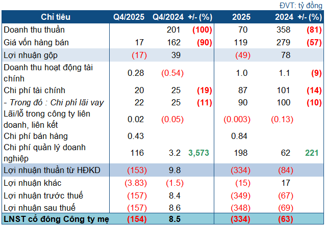 Khoản lỗ nặng trong quý 4 khiến bức tranh kinh doanh năm qua của DDG trở nên u ám. Lũy kế 2025, Doanh nghiệp chỉ đạt 70 tỷ đồng doanh thu thuần, rơi 81% so với năm trước; lỗ ròng tới 334 tỷ đồng (cùng kỳ lỗ 63 tỷ đồng), cũng là mức cao nhất từ trước tới nay. Lỗ lũy kế trên bảng cân đối lên tới 504 tỷ đồng, ăn mòn vốn chủ.