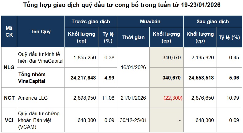 Ở chiều ngược lại, dòng tiền quỹ ghi nhận lực mua tại một cổ phiếu bất động sản. Sau giao dịch mua 340,670 cp NLG trong phiên 16/01, quỹ VinaCapital đã nâng tỷ lệ sở hữu tại CTCP Đầu tư Nam Long lên trên 5%, qua đó trở thành cổ đông lớn. Ước tính quỹ chi hơn 10 tỷ đồng theo giá đóng cửa phiên giao dịch.