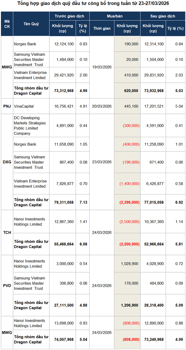 Trong tuần 23–27/03/2026, hoạt động giao dịch của quỹ đầu tư trở nên sôi động với Dragon Capital là tâm điểm khi liên tục mua bán cổ phiếu.