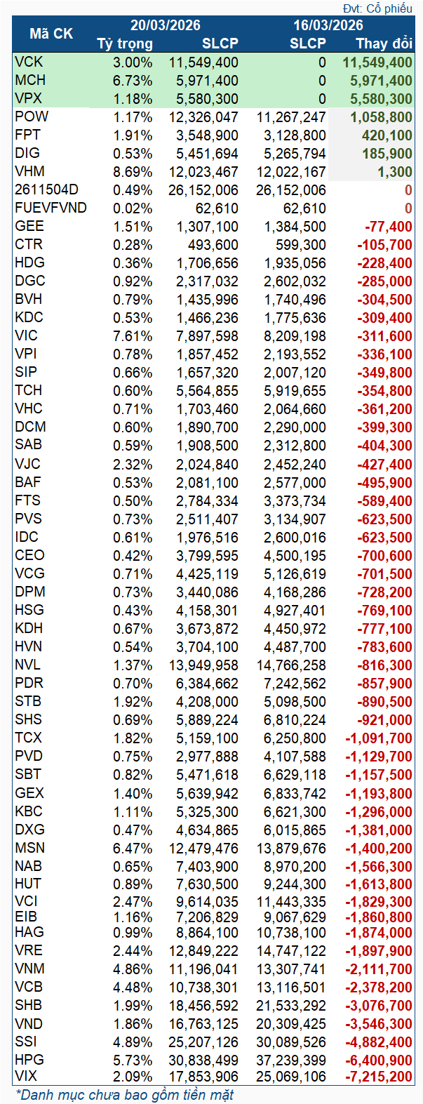 Thay đổi cổ phiếu quỹ VNM ETF trong tuần 16-20/03/2026