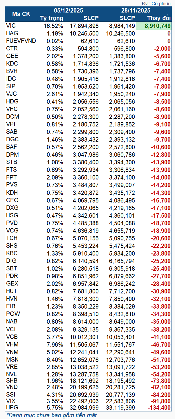 Thay đổi cổ phiếu của quỹ VNM ETF trong tuần 28/11 - 05/12/2025