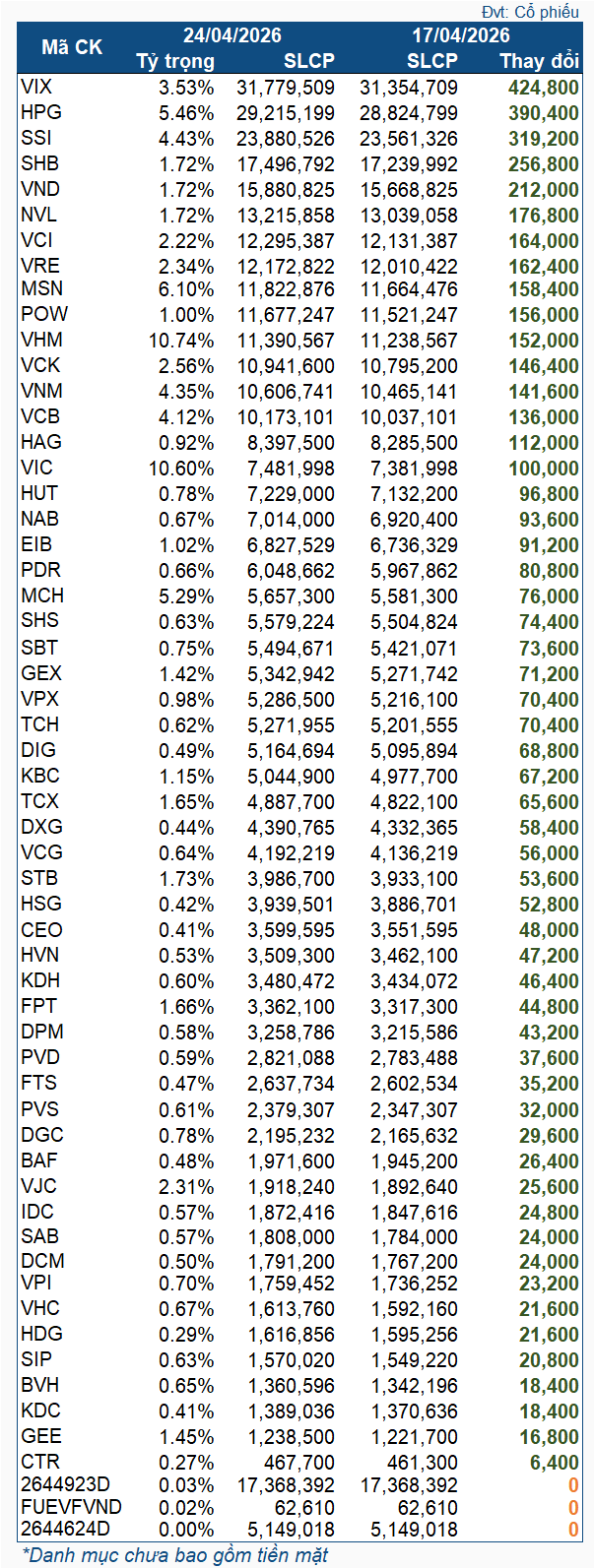 Thay đổi cổ phiếu quỹ VNM ETF trong tuần 17-24/04