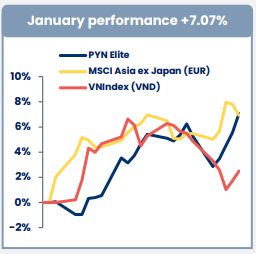 Kết thúc tháng đầu năm, trong khi VN-Index chỉ tăng 2.5% do chịu áp lực từ nhóm cổ phiếu Vingroup, PYN Elite đạt mức tăng 7.1% so với tháng trước, đánh dấu hiệu suất tháng 1 cao nhất kể từ năm 2024.