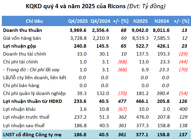 Lũy kế cả năm, doanh thu thuần 9,042 tỷ đồng, tăng 13% và lãi ròng hơn 377 tỷ đồng, gấp gần 2.4 lần năm trước, mức cao nhất trong 7 năm qua, đồng thời vượt kế hoạch năm. Năm 2026, Ricons đặt mục tiêu doanh thu dự kiến tăng hơn 30% so với năm 2025.