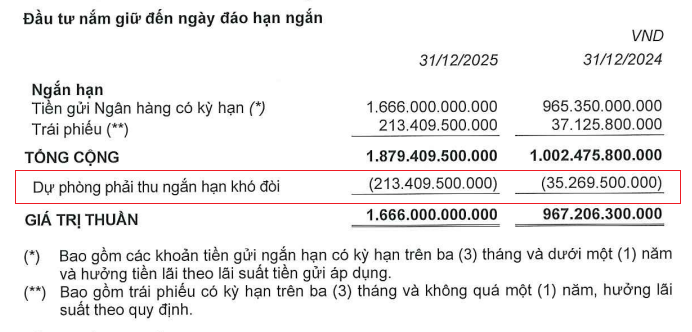Đầu tư tài chính ngắn hạn hơn 1,879 tỷ đồng, chủ yếu là tiền gửi ngân hàng có kỳ hạn dưới 1 năm và nắm giữ hơn 213 tỷ đồng trái phiếu. Đáng lưu ý, toàn bộ hơn 213 tỷ đồng trái phiếu đã được Doanh nghiệp trích lập dự phòng phải thu ngắn hạn khó đòi.