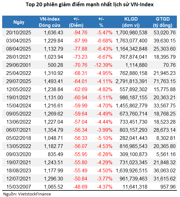 Phiên 20/10, thị trường chứng khoán chứng kiến cú sập mạnh. VN-Index giảm xấp xỉ 95 điểm từ vùng 1,730 điểm về còn 1,636 điểm. Đây là mức giảm tính theo điểm số vô tiền khoán hậu trong lịch thị trường chứng khoán Việt Nam.