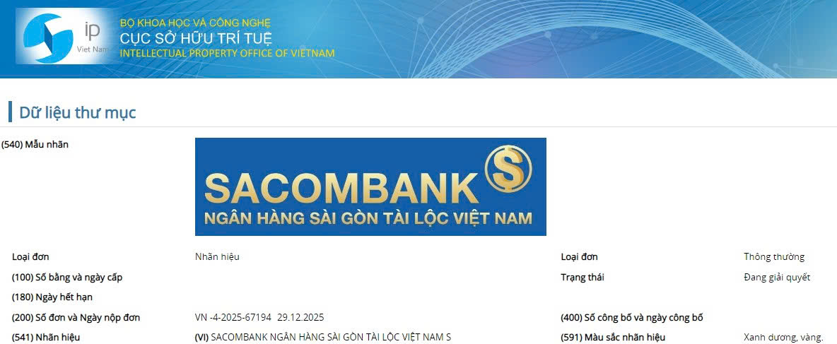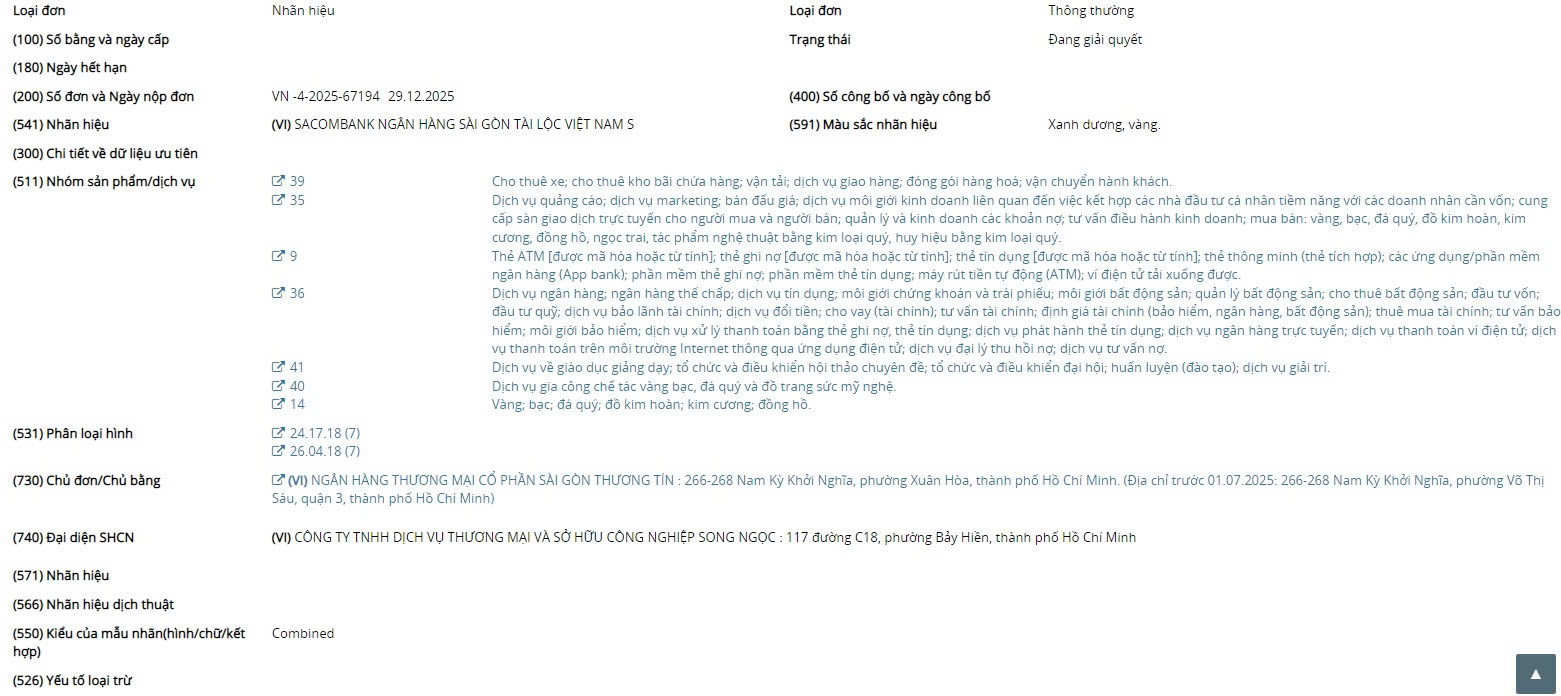 Theo dữ liệu cập nhật từ Cục Sở hữu trí tuệ, tại đơn đăng ký nhãn hiệu số VN-4-2025-67194, tên gọi thương mại của SACOMBANK được đề xuất chuyển thành "NGÂN HÀNG SÀI GÒN TÀI LỘC VIỆT NAM".
