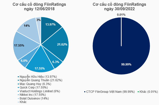 Cơ cấu cổ đông của FiinRatings biến động lớn vào tháng 8/2022 khi 4 cổ đông ngoại gồm Nikkei Inc, Viaduct Holdings Limited, Quick Corp, ông Bolat Duisenov (sở hữu tổng cộng 55.11%), cùng nhiều cổ đông trong nước khác chuyển giao gần toàn bộ vốn cho CTCP FiinGroup Việt Nam. Hiện Công ty do ông Nguyễn Quang Thuân làm Tổng Giám đốc kiêm đại diện pháp luật.