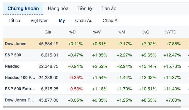 Kết thúc phiên giao dịch ngày 15/09, chỉ số S&P 500 tiến 0.5% lên 6,615.28 điểm, đánh dấu lần đầu tiên đóng cửa trên mốc 6,600 điểm. Chỉ số Nasdaq Composite cũng tăng lên mức cao mọi thời đại mới, cộng 0.9% lên 22,348.75 điểm. Chỉ số Dow Jones nhích 49.23 điểm (tương đương 0.1%) lên 45,883.45 điểm.