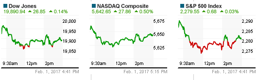 Kết thúc phiên giao dịch ngày thứ Tư, chỉ số Dow Jones tiến 26.85 điểm (tương đương 0.14%) lên 19,890.94 điểm, chỉ số S&P 500 cộng 0.68 điểm (tương đương 0.03%) lên 2,279.55 điểm và chỉ số Nasdaq Composite tăng 27.87 điểm (tương đương 0.5%) lên 5,642.65 điểm.