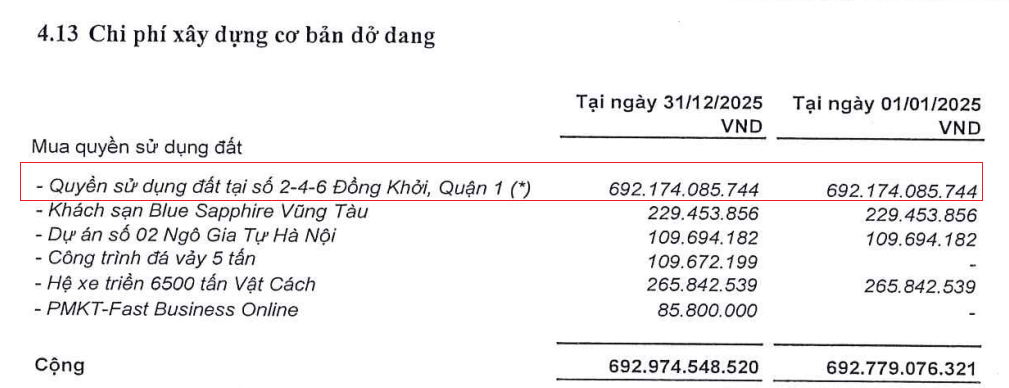 Đáng chú ý, thời điểm cuối năm 2025, chi phí xây dựng cơ bản dở dang tại khu đất này đã lên hơn 692 tỷ đồng. SEA cho biết quyết định 6739/QĐ-UBND ngày 10/12/2015 về duyệt phương án giá đất theo giá thị trường của khu đất số 2-4-6 đường Đồng Khởi, SEA đã hoàn thành đầy đủ nghĩa vụ tài chính để chuyển nhượng quyền sử dụng đất, được Chi cục Thuế Quận 1 xác nhận nộp tiền đất ngày 24/01/2017 và Sở Tài chính TPHCM xác nhận hoàn tất nghĩa vụ tài chính theo Công văn số 814 ngày 27/01/2017. Dù vậy, đến nay doanh nghiệp vẫn chưa được cấp Giấy chứng nhận quyền sử dụng đất để triển khai dự án trung tâm thương mại, văn phòng và căn hộ trên khu đất này.