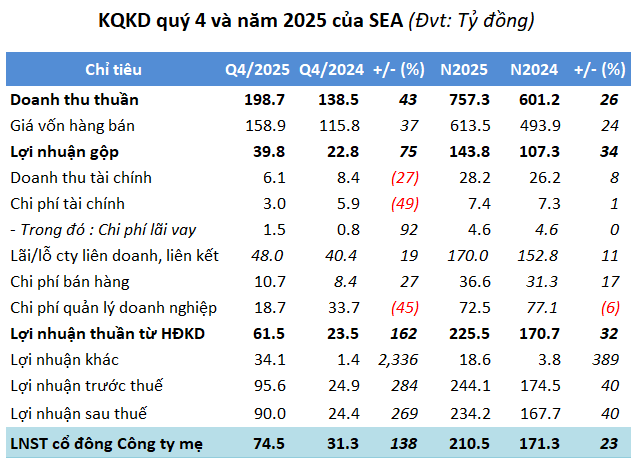 Song song với biến động cổ đông, hoạt động kinh doanh của SEA cũng chuyển biến. Quý 4/2025, doanh thu thuần gần 199 tỷ đồng, tăng 43% so với cùng kỳ năm trước đó; trong khi lãi ròng gần 75 tỷ đồng, gấp 2.4 lần và là mức cao nhất trong 6 năm.