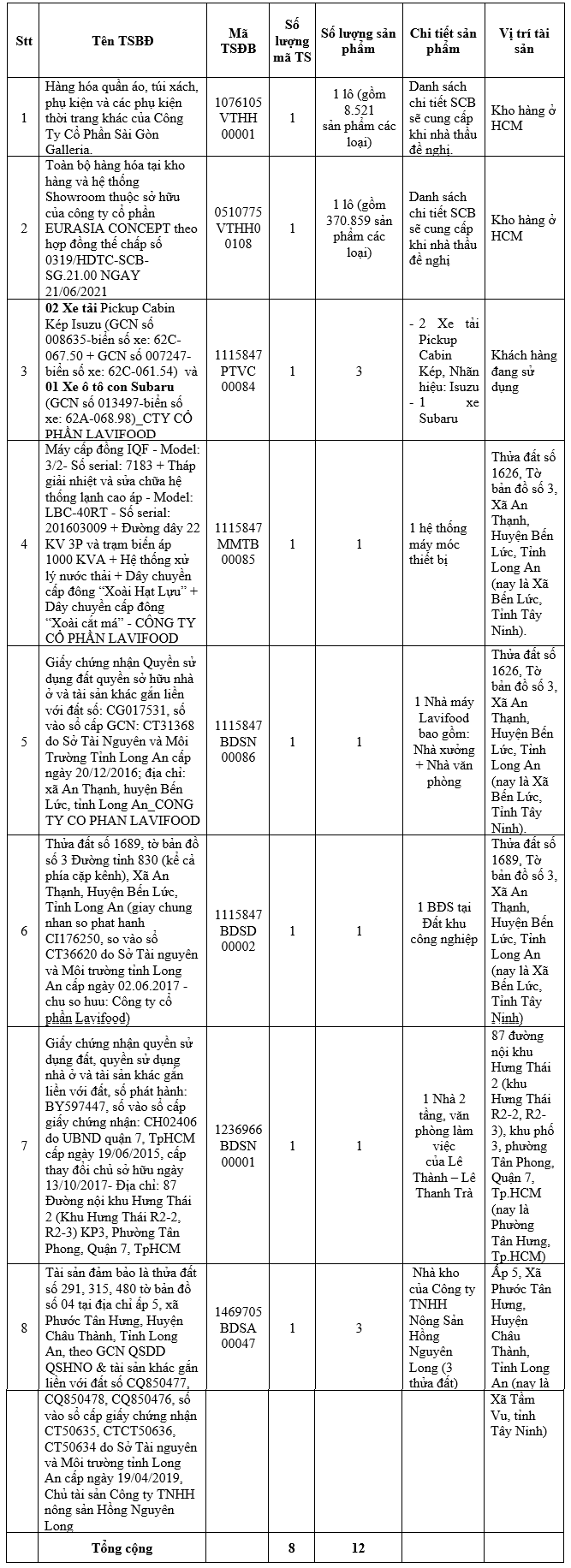 Trong đợt xử lý đầu tiên này, SCB đã hoàn thiện đầy đủ cơ sở pháp lý cho 8 mã tài sản (tương ứng 12 tài sản bảo đảm) để sẵn sàng thực hiện các thủ tục định giá, đấu giá. Danh mục bao gồm: Bất động sản giá trị cao gồm quyền sử dụng đất và tài sản gắn liền với đất; hệ thống động sản: Phương tiện vận tải, máy móc, thiết bị phục vụ sản xuất kinh doanh; Hàng hóa tiêu dùng và kho bãi: Hơn 8,500 sản phẩm thời trang (quần áo, túi xách, phụ kiện...) và hơn 370,859 chi tiết hàng tồn kho khác.