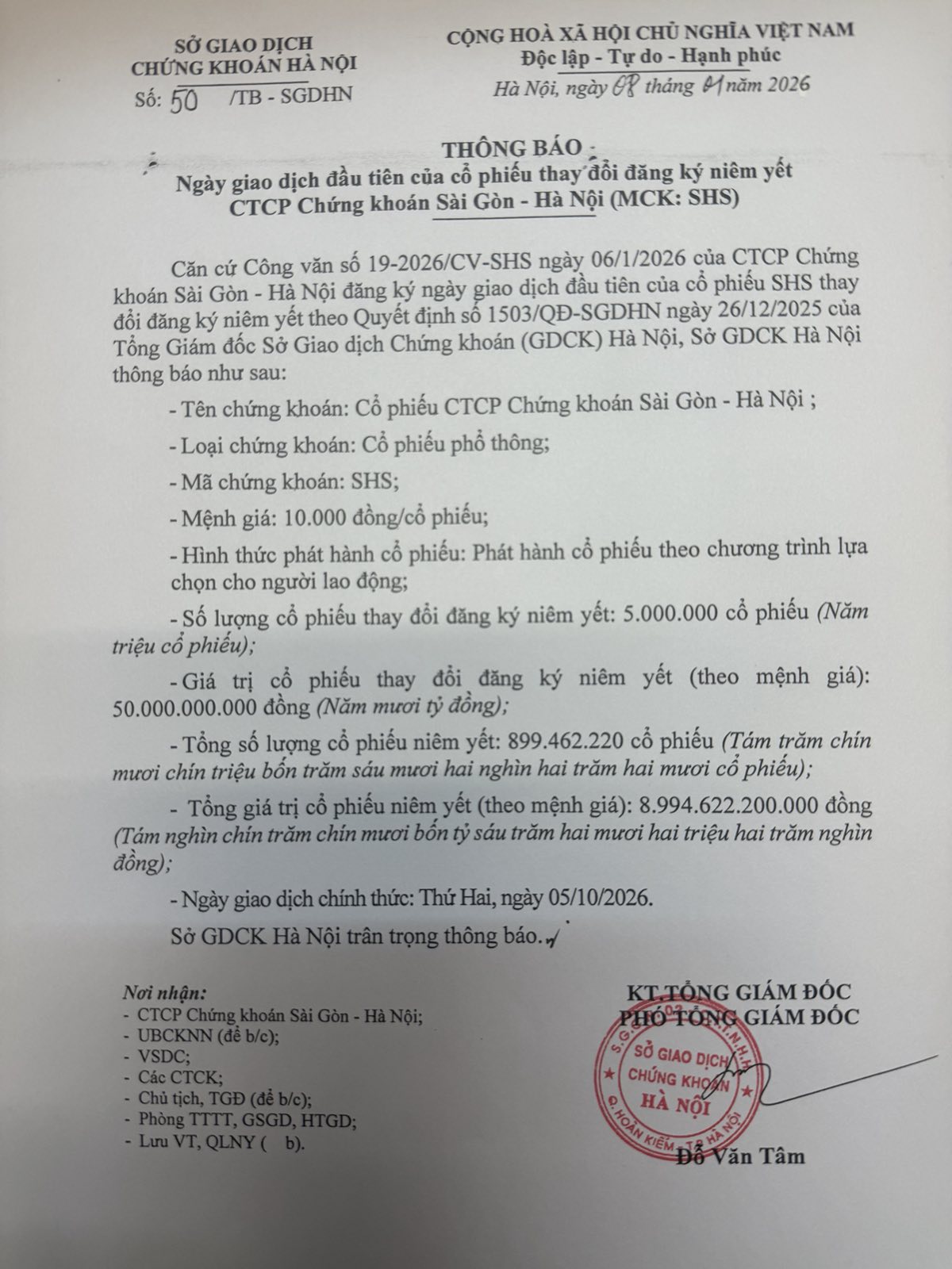 SHS: Ngày 05/10/2026, Thông báo ngày giao dịch đầu tiên niêm yết bổ sung