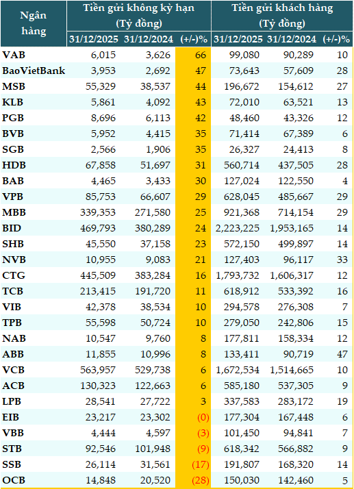 Dữ liệu từ VietstockFinance cho thấy, tính đến 31/12/2025, tổng lượng tiền gửi khách hàng tại 28 ngân hàng đạt 12.88 triệu tỷ đồng, tăng 15% so với đầu năm. Trong đó, tổng lượng tiền gửi không kỳ hạn (CASA) là gần 2.8 triệu tỷ đồng, tăng 14% so với đầu năm.