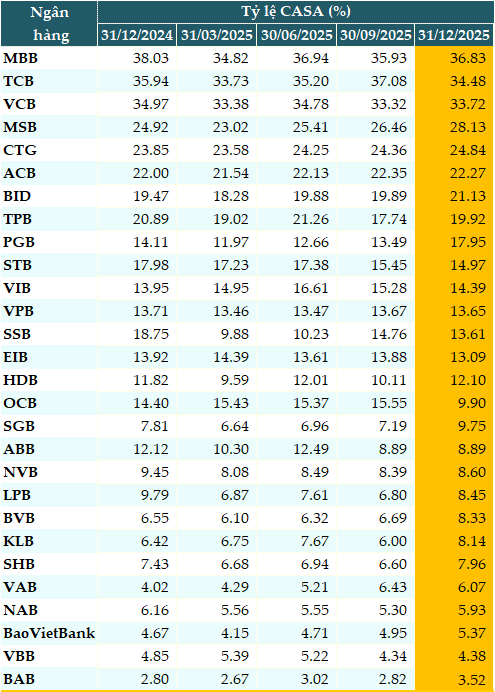 MB dẫn đầu hệ thống về tỷ lệ CASA, đạt 36.83%; kế đó là TCB với 34.48%, thứ ba là VCB (33.72%); thứ tư là MSB (28.13%) và VietinBank (CTG, 24.84%).