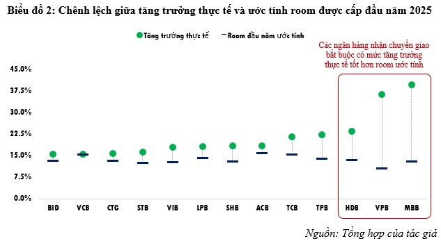 Tuy nhiên, các ngân hàng đang hỗ trợ NHNN trong quá trình tái cơ cấu khi nhận chuyển giao đặc biệt như MBB, HDB, VPB sẽ có thể được cấp mức tăng trưởng vượt trội. Theo ước tính, room năm 2025 của MBB đạt khoảng 13% trong khi tăng trưởng thực tế đạt gần 40%, cao gấp đôi so với mức tăng trưởng chung của toàn hệ thống. Xu hướng tương tự cũng được ghi nhận tại VPB với mức tăng trưởng 36.2%, hay HDB với mức tăng trưởng 23.5% (so với room ước tính khoảng 13.3%).