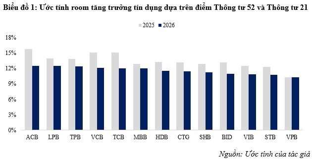 Theo cơ chế tại Thông tư 52 và Thông tư 21, hạn mức tăng trưởng tín dụng của từng ngân hàng được phân bổ dựa trên kết quả xếp hạng tổ chức tín dụng, với các tiêu chí trọng tâm bao gồm mức độ an toàn vốn, chất lượng tài sản, năng lực quản trị điều hành và mức độ tuân thủ quy định. Trên cơ sở đó, tác giả tiến hành ước tính điểm xếp hạng dựa trên các chỉ tiêu định lượng có thể thu thập từ báo cáo tài chính, sau đó kết hợp với một hệ số nhân chung để ước tính hạn mức tín dụng được phân bổ đầu năm. Dựa vào chính sách của NHNN qua từng thời kỳ mà NHNN sẽ thực hiện ấn định một mức hệ số nhất định, ví dụ như mức hệ số áp dụng cho năm 2024 và 2025 là 3.5 trong khi mức hệ số được áp dụng cho năm 2026 là 2.6. Là nếu một ngân hàng có mức điểm năng lực tài chính là 4.0x năm 2025 thì ngân hàng này sẽ được cấp mức room tín dụng đầu năm là: 4.0 * 3.5% = 14%, trong khi cũng cùng với số điểm trên thì năm 2026, ngân hàng này chỉ được cấp là: 4.0 * 2.6 = 10.4%. Dựa vào mức điểm được ước tính thì biểu đồ bên dưới thể hiện mức room tín dụng của các ngân hàng được ước tính cho năm 2025 và năm 2026.