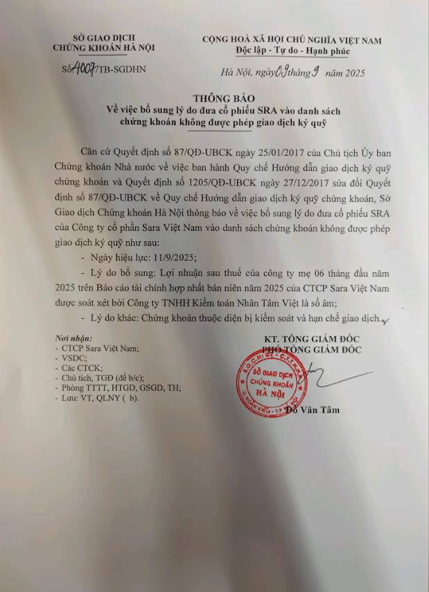SRA: Thông báo về việc bổ sung lý do đưa cổ phiếu vào danh sách chứng khoán không đủ điều kiện giao dịch ký quỹ
