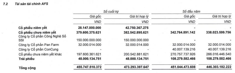 Đối với tài sản tài chính sẵn sàng để bán (AFS), Công ty ghi nhận thêm khoản đầu tư vào CTCP Công nghệ số SSI với giá trị 150 tỷ đồng.