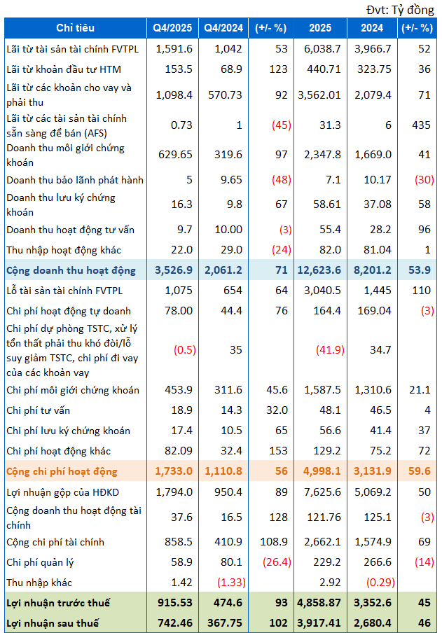 Lũy kế cả năm 2025, Công ty ghi nhận doanh thu hoạt động hơn 12.6 ngàn tỷ đồng, lãi trước thuế 4.8 ngàn tỷ đồng. Ước tính hợp nhất, doanh thu và lãi trước thuế đạt 13.1 ngàn tỷ đồng và gần 5.1 ngàn tỷ đồng, lần lượt vượt gần 36% và 20% kế hoạch được ĐHĐCĐ thông qua. Báo cáo công ty mẹ thể hiện hầu hết các nguồn thu của Công ty đều tăng so với năm trước. Lãi từ các khoản cho vay và phải thu lên tới hơn 3.5 ngàn tỷ đồng, tăng hơn 70%. Doanh thu môi giới chứng khoán đạt 2.3 ngàn tỷ đồng, tăng hơn 40%.