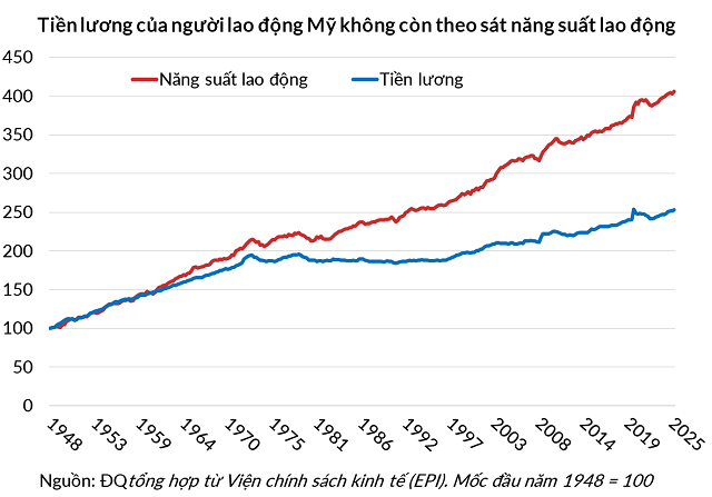 Trong 50 năm qua, năng suất lao động của người Mỹ đã tăng gần gấp đôi, nhưng tiền lương trung bình (đã điều chỉnh theo lạm phát) chỉ tăng 35%.