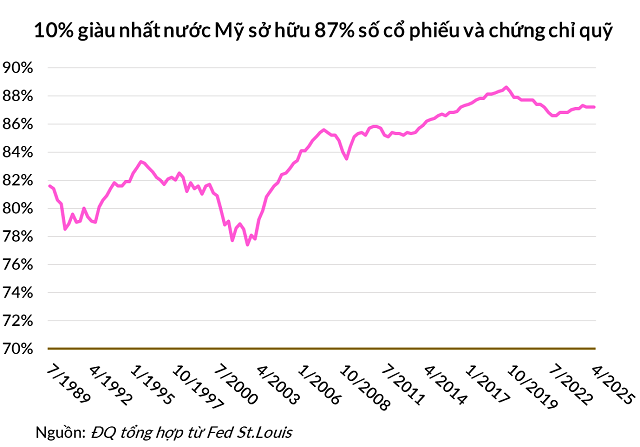 Tính đến quý 2/2025, 10% số người giàu nhất nước Mỹ sở hữu 87.2% số cổ phiếu và chứng chỉ quỹ tương hỗ (mutual fund), trong khi 50% số người nghèo nhất, tương đương 170 triệu người, chỉ nắm giữ 1.1%.