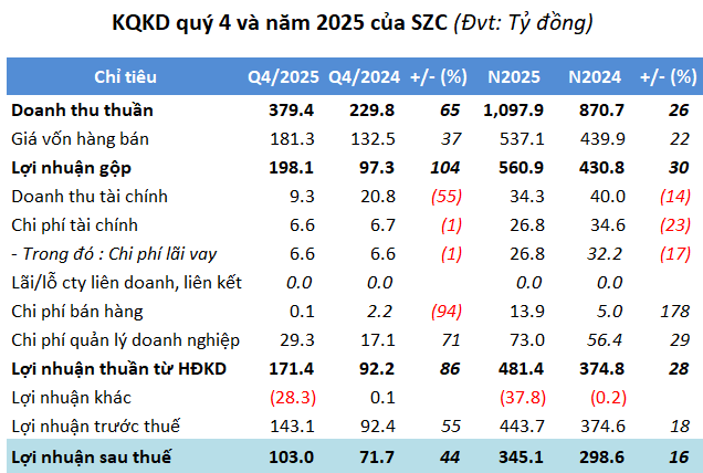 Nhờ kết quả tích cực trong quý cuối năm, SZC khép lại năm 2025 với dấu mốc kỷ lục khi doanh thu lần đầu vượt ngàn tỷ, đạt gần 1,098 tỷ đồng, tăng 26% so với năm trước. Lợi nhuận sau thuế đạt hơn 345 tỷ đồng, mức cao nhất từ trước đến nay.