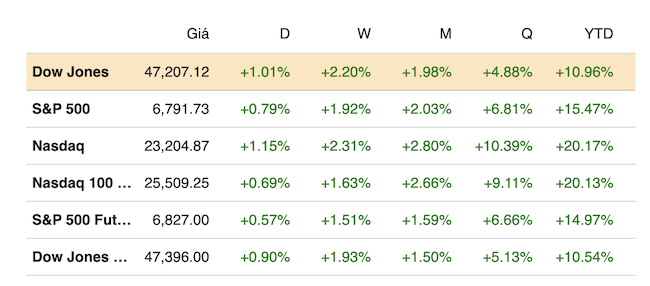 Kết thúc phiên giao dịch ngày 24/10, chỉ số Dow Jones tăng 472.51 điểm (tương đương 1.01%) lên 47,207.12 điểm, đánh dấu lần đầu tiên đóng cửa trên mốc 47,000 điểm. Chỉ số S&P 050 cộng 0.79% lên 6,791.69 điểm, còn chỉ số Nasdaq Composite tiến 1.15% lên 23,204.87 điểm. Cả 3 chỉ số chính đều đóng cửa ở mức cao kỷ lục.