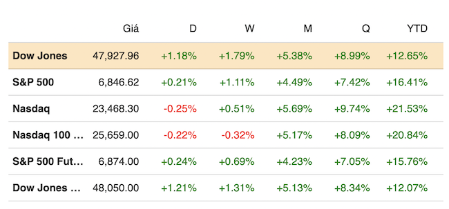 Kết thúc phiên giao dịch ngày 11/11, chỉ số Dow Jones cộng 559.33 điểm (tương đương 1.18%) lên 47,927.96 điểm, với việc các nhà đầu tư mua vào nhiều cổ phiếu blue-chip, bao gồm các gã khổng lồ trong lĩnh vực chăm sóc sức khoẻ Merck, Amgen và Johnson & Johnson. Chỉ số S&P 500 tiến 0.21% lên 6,846.61 điểm. Tuy nhiên, chỉ số Nasdaq Composite mất 0.25% còn 23,468.30 điểm.