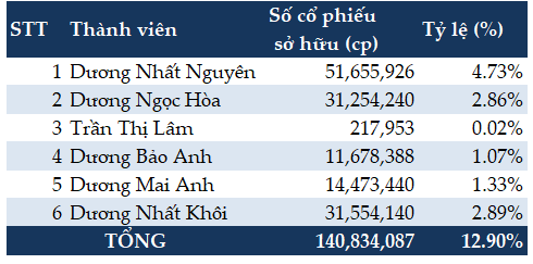 Bà Trần Thị Lâm - mẹ của ông Dương Nhất Nguyên sở hữu 217,953 cp (0.02%); 2 em gái của ông Dương Nhất Nguyên là bà Dương Bảo Anh sở hữu 11.67 triệu cp (1.07%); bà Dương Mai Anh sở hữu 14.4 triệu cp (1.33%).