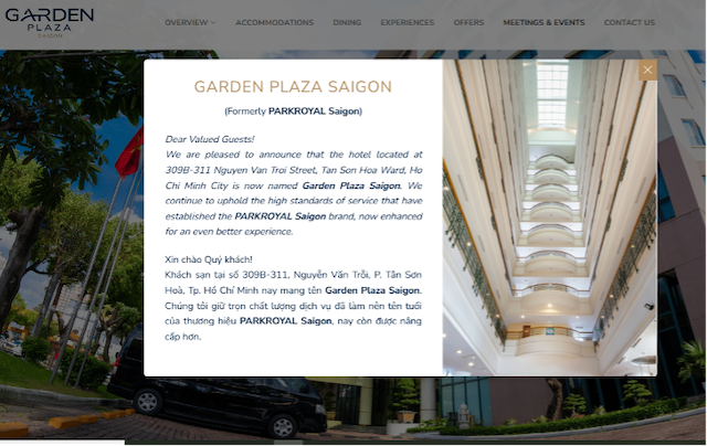 Trên fanpage cũng như website khách sạn tại số 309B-311, Nguyễn Văn Trỗi, phường Tân Sơn Hòa, TPHCM cho hay, từ ngày 16/08/2025, Parkroyal Saigon chính thức đổi tên thành Garden Plaza Saigon.