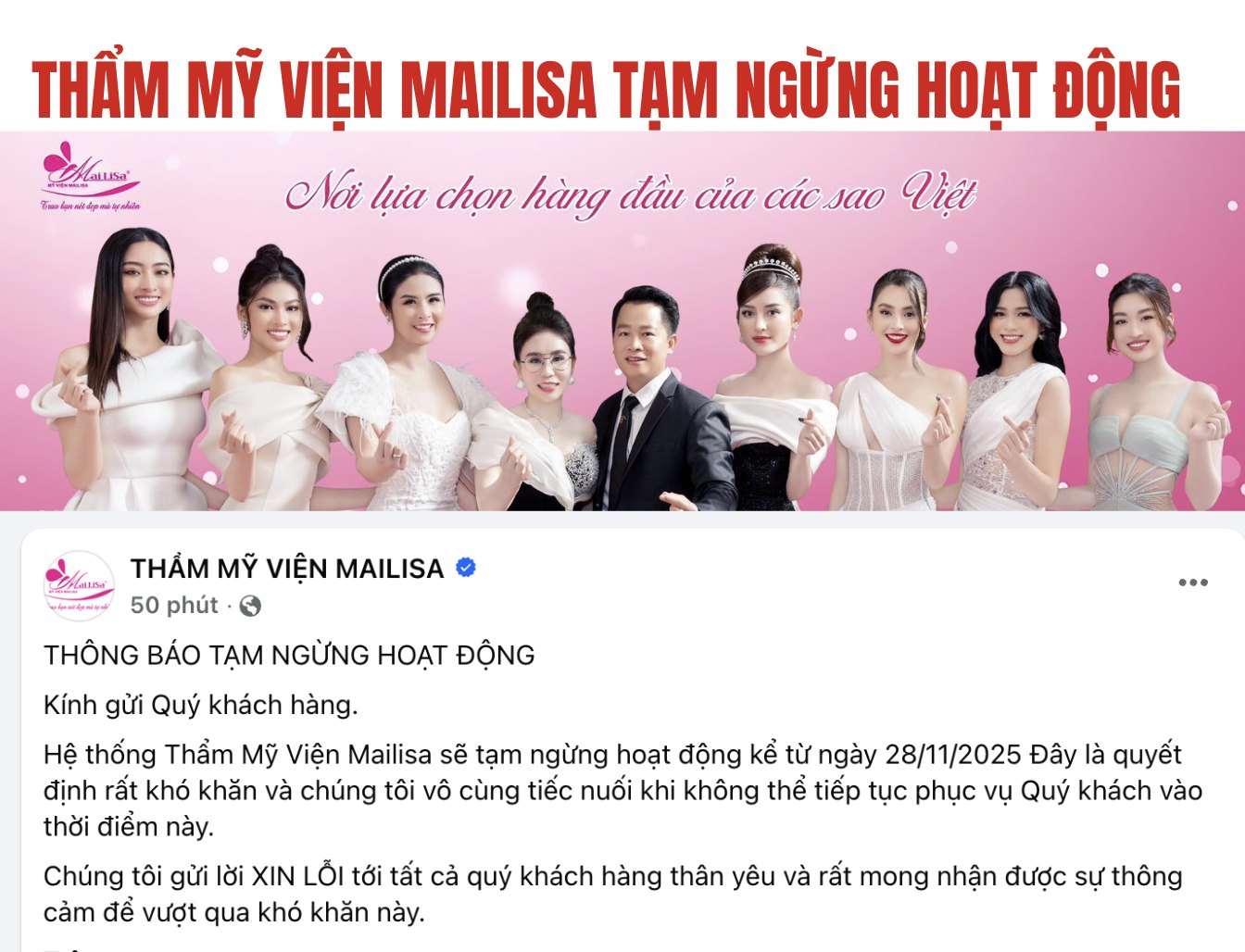 Tối 27/11, tài khoản mạng xã hội chính thức của Thẩm mỹ viện Mailisa với hơn 2.8 triệu người theo dõi đăng thông báo tạm dừng hoạt động toàn hệ thống từ ngày 28/11. Nội dung chỉ nêu quyết định khó khăn này và lời xin lỗi gửi khách hàng, không tiết lộ lý do hay thời điểm trở lại.
