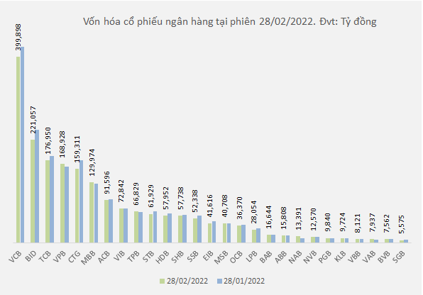 Trong tháng Hai, giá trị vốn hóa của nhóm ngân hàng giảm 86,013 tỷ đồng, xuống còn 1.97 triệu tỷ đồng (tính đến phiên 28/02/2022), tỷ lệ giảm 4% so với mức 2.1 triệu tỷ đồng của phiên cuối tháng 1.
