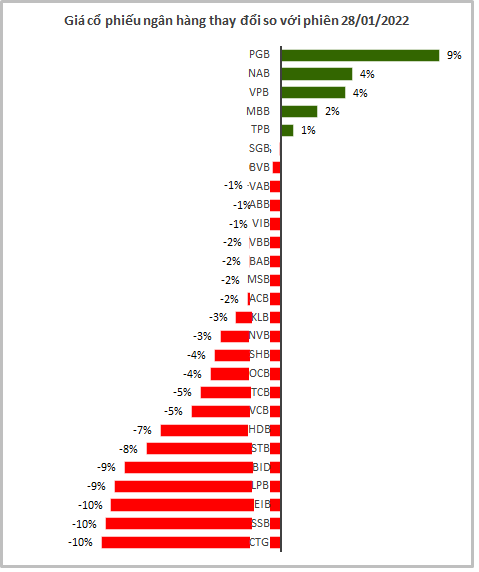 Ở nhóm ngân hàng “gốc” Nhà nước, vốn hóa VietinBank (CTG) giảm mạnh nhất với 10%, còn BIDV (BID) và Vietcombank lần lượt giảm 9% và 5%.
