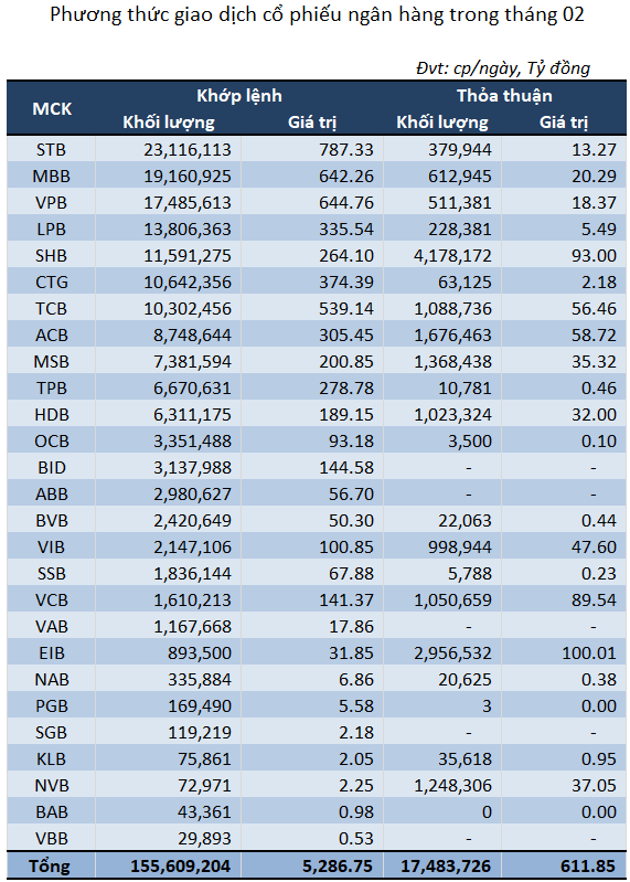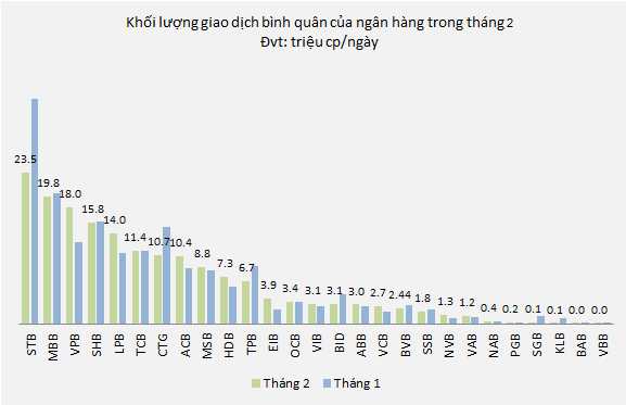 Tháng 2 này, thanh khoản cổ phiếu STB dẫn đầu, với khối lượng khớp lệnh bình quân mỗi ngày gần 24 triệu cp, giảm 33% so tháng 1.