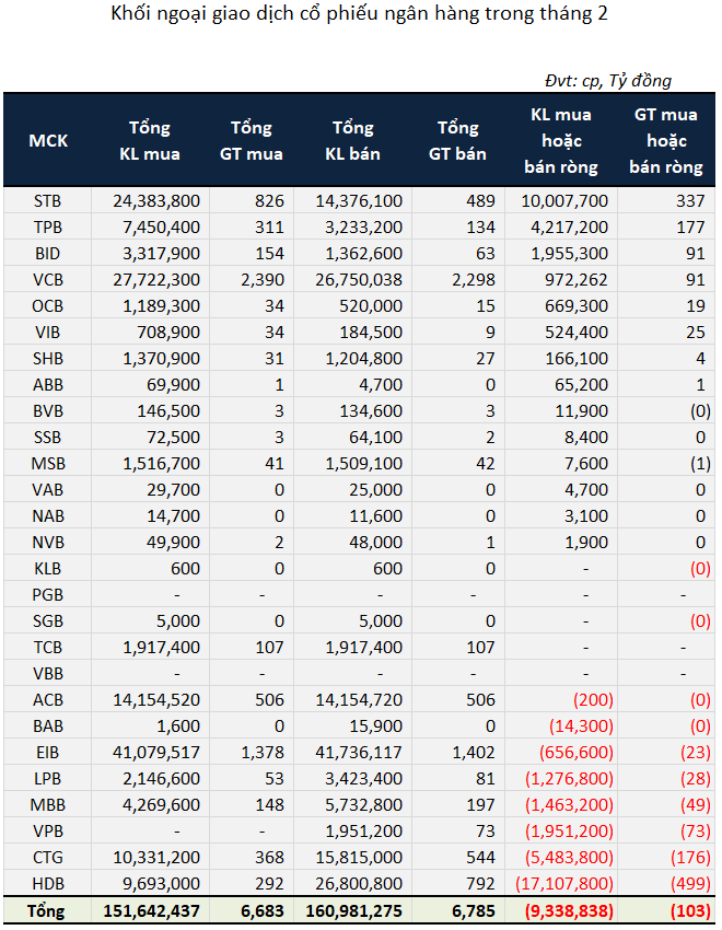 Trong tháng 2, khối ngoại đã bán ròng hơn 9 triệu cp ngành ngân hàng. Theo đó, giá trị mua ròng gần 103 tỷ đồng.