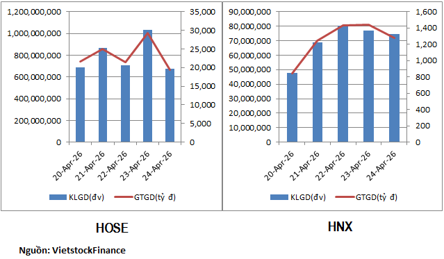 Tuần 20 - 24/04, thanh khoản thị trường tiếp tục xuống thấp. Khối lượng và giá trị giao dịch trên cả hai sàn niêm yết đều giảm so với tuần trước.