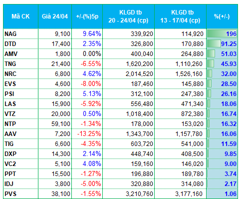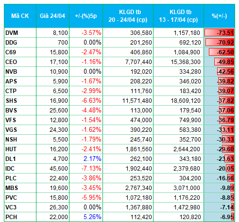 Cổ phiếu chứng khoán như VCK, HCM, APG, HCM, APS, SHS, BVS, VFS, MBS nằm trong nhóm cổ phiếu giảm mạnh thanh khoản so với tuần trước.