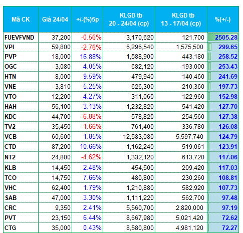 Top 20 mã có thanh khoản tăng/giảm cao nhất sàn HOSE