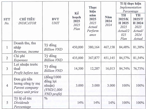 HĐQT Công ty cũng thông qua việc tạm phân phối lợi nhuận 2025, bao gồm quỹ khen thưởng và phúc lợi 22.5%, quỹ khen thưởng Ban Điều hành 5% và chia cổ tức tiền mặt theo tỷ lệ 14% (1,400 đồng/cp). Đồng thời, phê duyệt đơn giá tiền lương thực hiện năm 2025 là 3,000 đồng/1,000 đồng lợi nhuận, bằng đơn giá kế hoạch đề ra và tương đương con số thực hiện năm 2024.