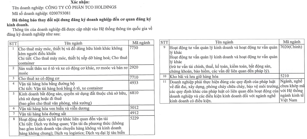 TCO thông báo danh sách ngành nghề kinh doanh mới