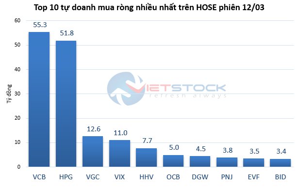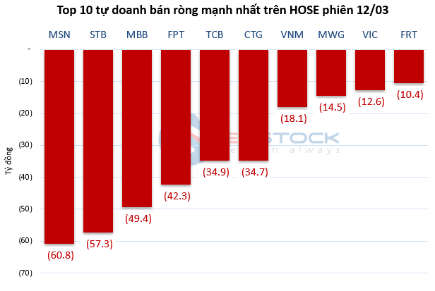 Sau phiên liền trước mua ròng hơn nửa ngàn tỷ đồng trên sàn HOSE, khối tự doanh công ty chứng khoán trong ngày 12/03 đã quay đầu bán ròng trở lại hơn 253 tỷ đồng.