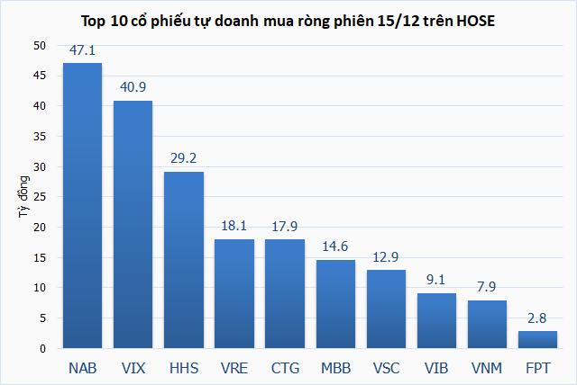Trong phiên 15/12, khối tự doanh bán ròng 60 tỷ đồng tại sàn HOSE. Trong đó, cổ phiếu được ròng mạnh nhất là NAB, với giá trị 47 tỷ đồng; tiếp sau đó là các mã VIX, HHS và VRE. Trong khi đó, MWG bị bán ròng mạnh nhất với giá trị lên đến gần 102 tỷ đồng.