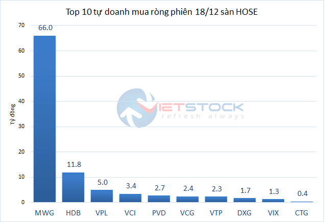 Trên sàn HOSE, khối tự doanh có phiên bán ròng thứ 2 liên tiếp với gần 369 tỷ đồng trong phiên 18/12. Cổ phiếu bị bán ròng nhiều nhất là VIC với gần 65 tỷ đồng. Còn cổ phiếu được mua ròng mạnh nhất là MWG với 66 tỷ đồng.