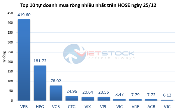 Trái ngược với diễn biến tiêu cực của chỉ số, dòng tiền từ các công ty chứng khoán tiếp tục duy trì trạng thái mua ròng phiên thứ 2 liên tiếp trên sàn HOSE, với giá trị đạt 586 tỷ đồng trong ngày 25/12.