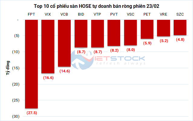 Ở chiều bán, tự doanh có phần đồng thuận với khối ngoại khi bán ròng FPT 28 tỷ đồng. VIX và VCB cũng bị bán lần lượt 17 tỷ đồng và 15 tỷ đồng.